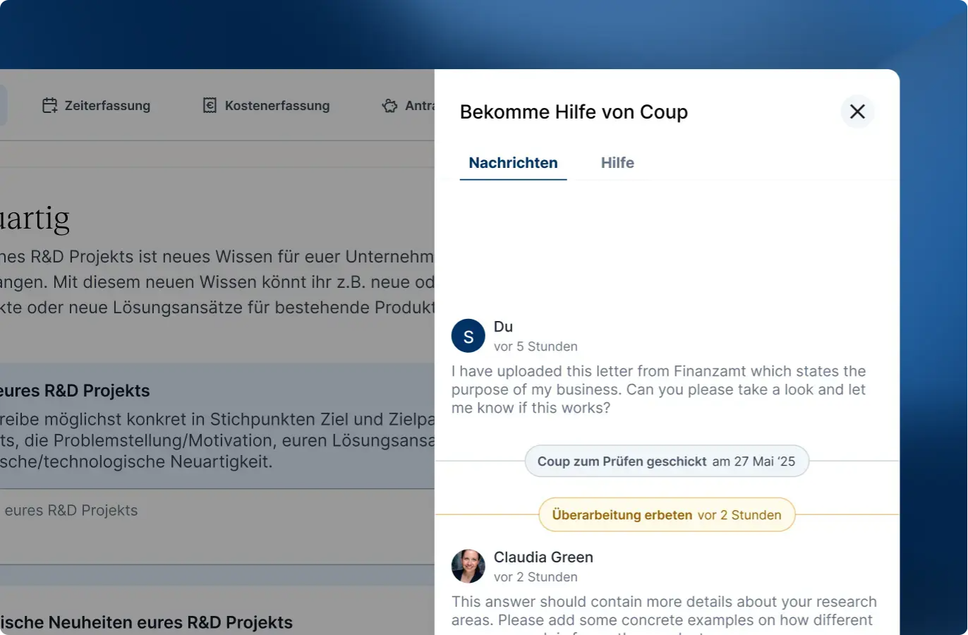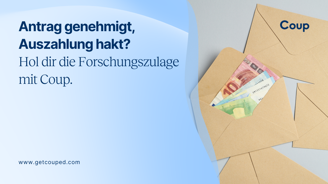 Mit Coup begleiten wir Unternehmen durch den sensibelsten und oft vernachlässigten Teil des gesamten Prozesses: den Antrag auf Forschungszulage beim Finanzamt und alles, was bis zur Auszahlung danach kommt.
