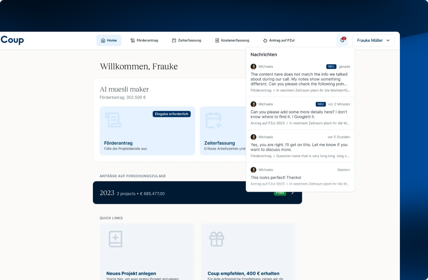 Coup ist die führende Plattform für Forschungszulagenmanagement in Deutschland. Wir helfen Startups, Scaleups und dem Mittelstand dabei, das Maximum aus ihren R&D-Investitionen herauszuholen, vom Antrag bis zur Auszahlung.