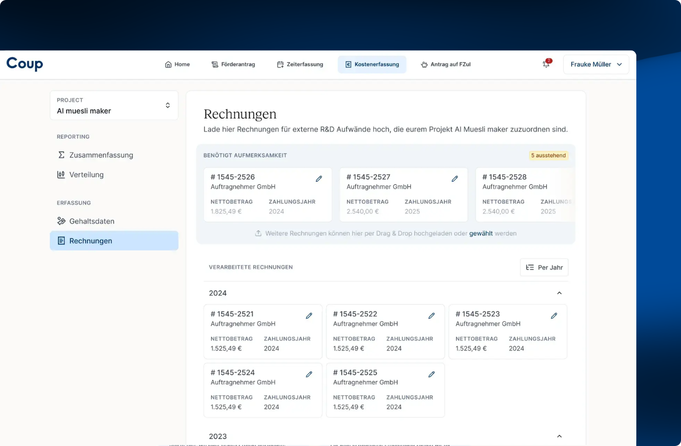 Das Zusammensuchen von Rechnungen und Unterlagen sind in der Praxis die größten Zeitfresser. Die Coup-Plattform strukturiert genau diese Pain Points und schafft einen klaren Prozess: