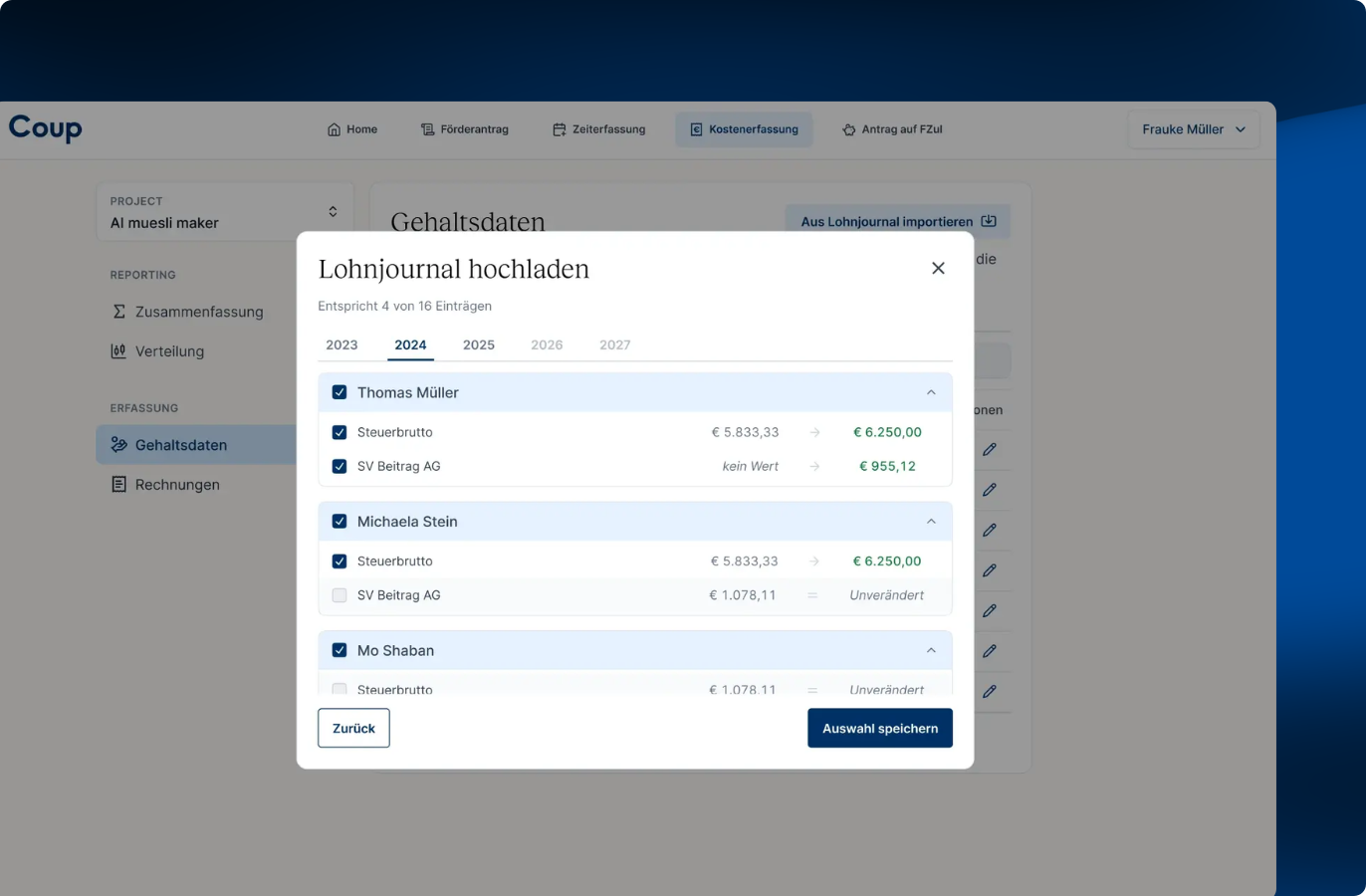 - Unser Coup-Plattform bündelt HR-Daten und Belege an einem Ort und ersetzt das manuelle Chaos bei der Erstellung des R&D-Reports.