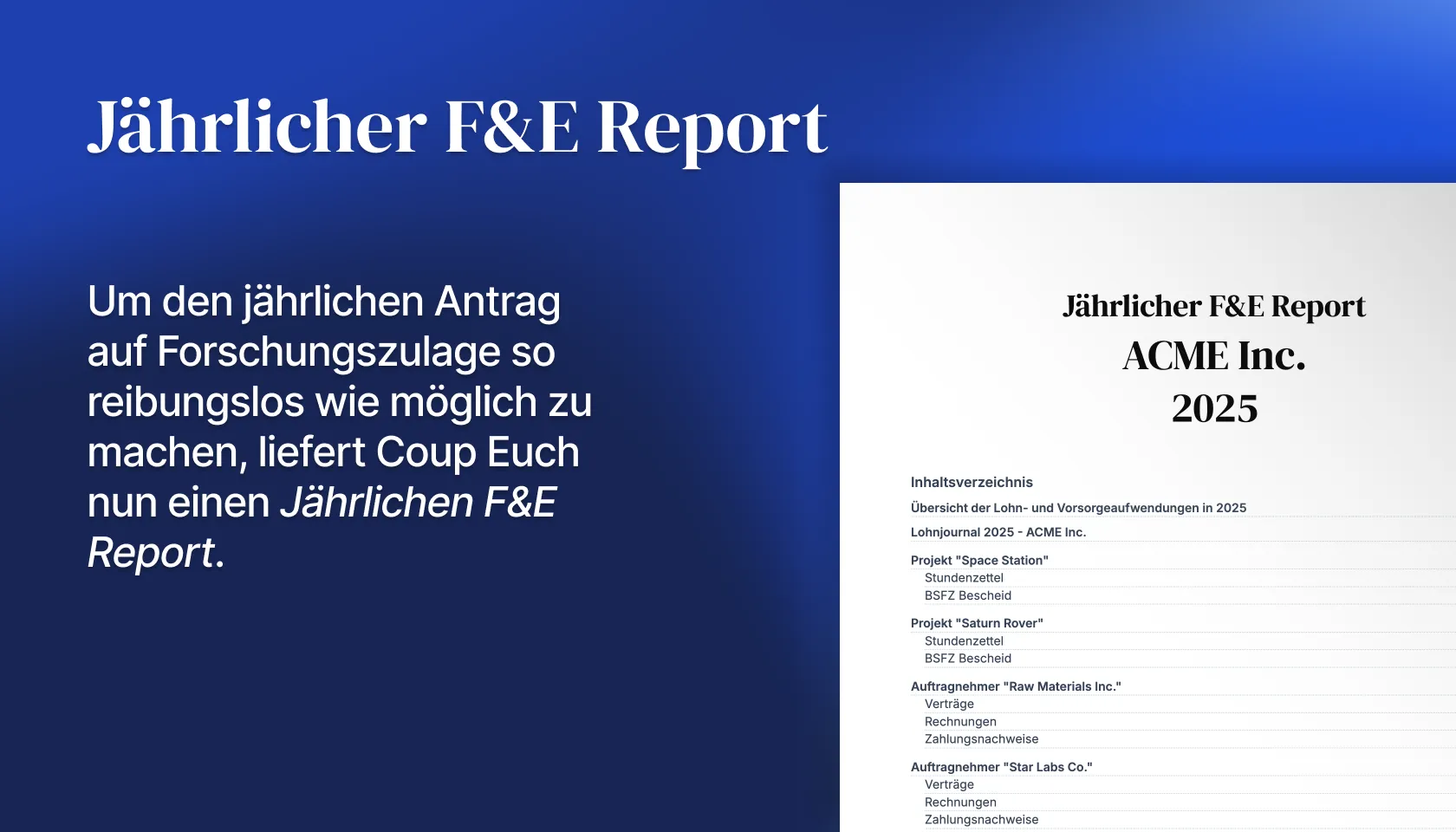 Der jährliche Antrag auf Forschungszulage dient zum Abruf von Fördermitteln vom Finanzamt. Um diesen Prozess so reibungslos und einfach wie möglich zu machen, erstellt Coup dafür einen Jährlichen F&E Report. Dieser beinhaltet Übersichten der förderfähigen Kosten, Stundenzettel, Lohnnachweise, sowie die Dokumentation möglicher Auftragnehmer im Projekt.
