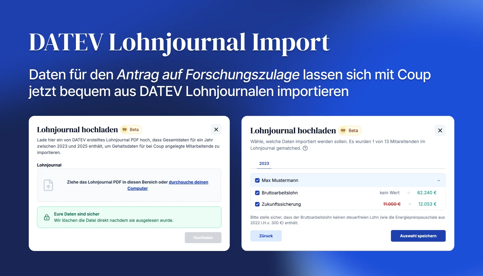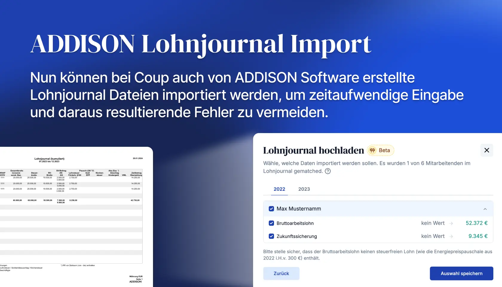 Aber jetzt kannst Du mit Coup diese Daten direkt aus jährlichen DATEV Lohnjournalen einlesen lassen. So wird manuelle Dateneingabe überflüssig gemacht, was Zeit spart und Fehler vermeidet.