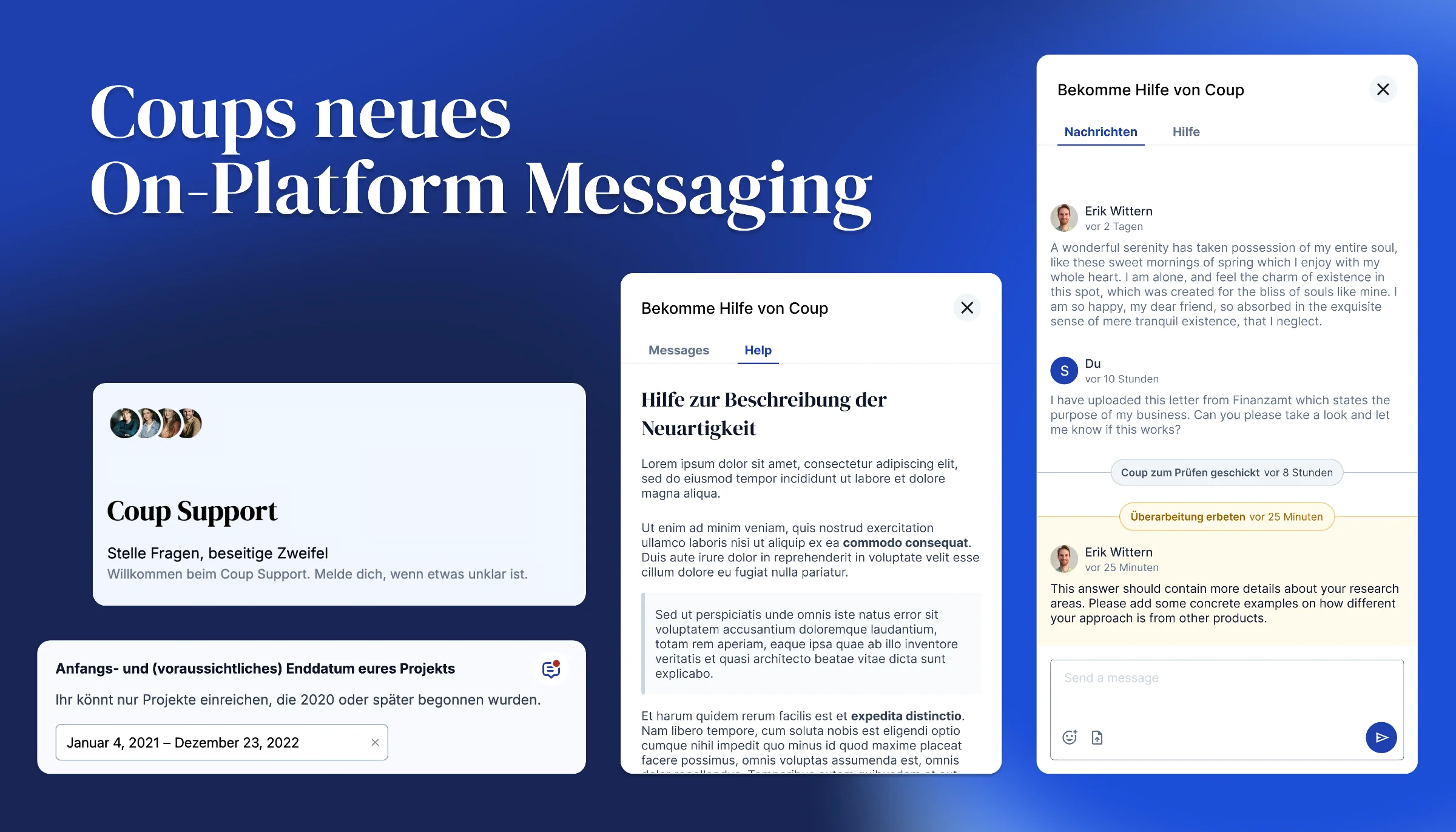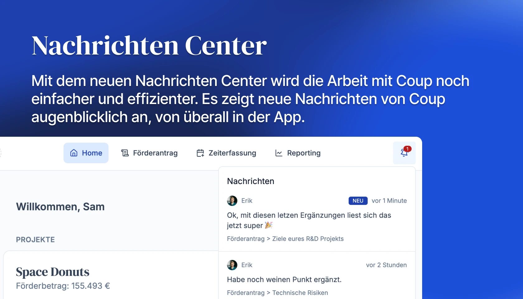 In der Vergangenheit beschränkte sich die on-platform Kommunikation auf Kommentare von Coup R&D Consultants in Folge von Antrags-Reviews, die dann widerum von euch beantwortet werden konnten.