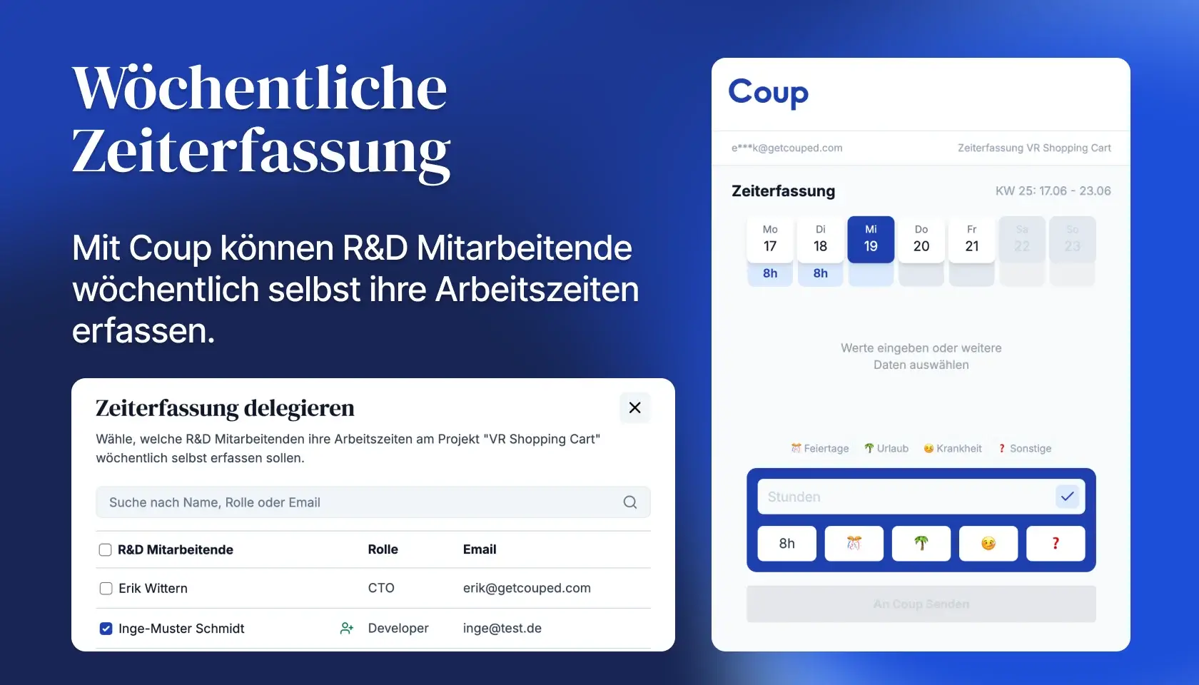 Dazu wählt ihr in der "Zeiterfassung" Sektion unter "Zeiterfassung delegieren" einfach die Mitarbeitenden aus, die gerade an einem R&D Projekt arbeiten und delegiert so die Zeiterfassung an sie. Sie erhalten dann, solange das Projekt läuft, Montagmorgens eine Email mit einem "magischen Link" zu ihrem persönlichen Stundenzettel für die vergangene Arbeitswoche. Der lässt sich in Sekunden ausfüllen, zum Beispiel vom SmartPhone aus - und ganz ohne Anmeldung bei Coup.