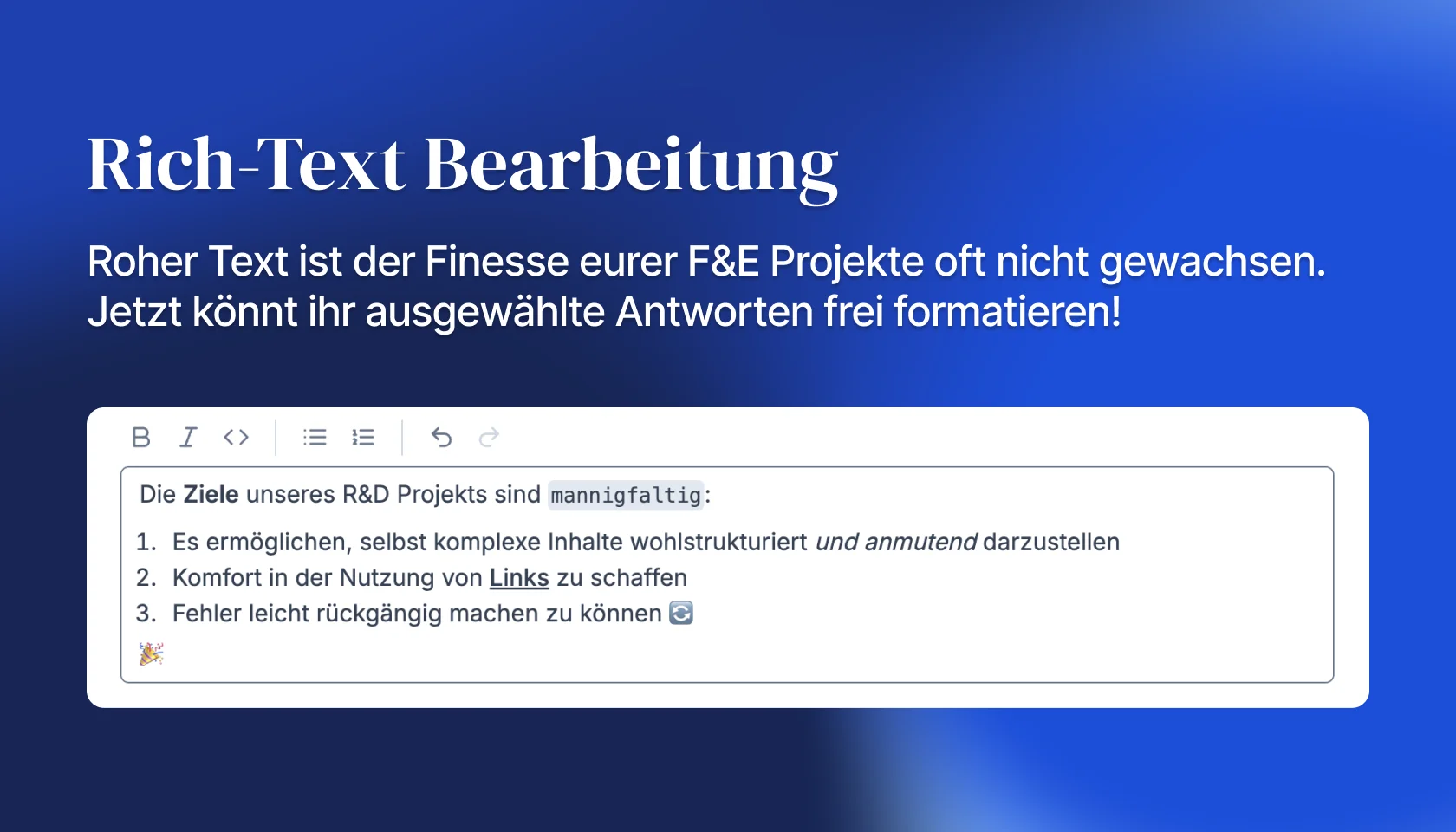 Daher haben wir für ausgewählte Fragen zu eurem Förderantrag die Möglichkeit geschaffen, Antworten in Rich-Text zu geben. Nun könnt ihr wichtige Punkte unterstreichen oder hervorheben, Links nützlicher machen oder