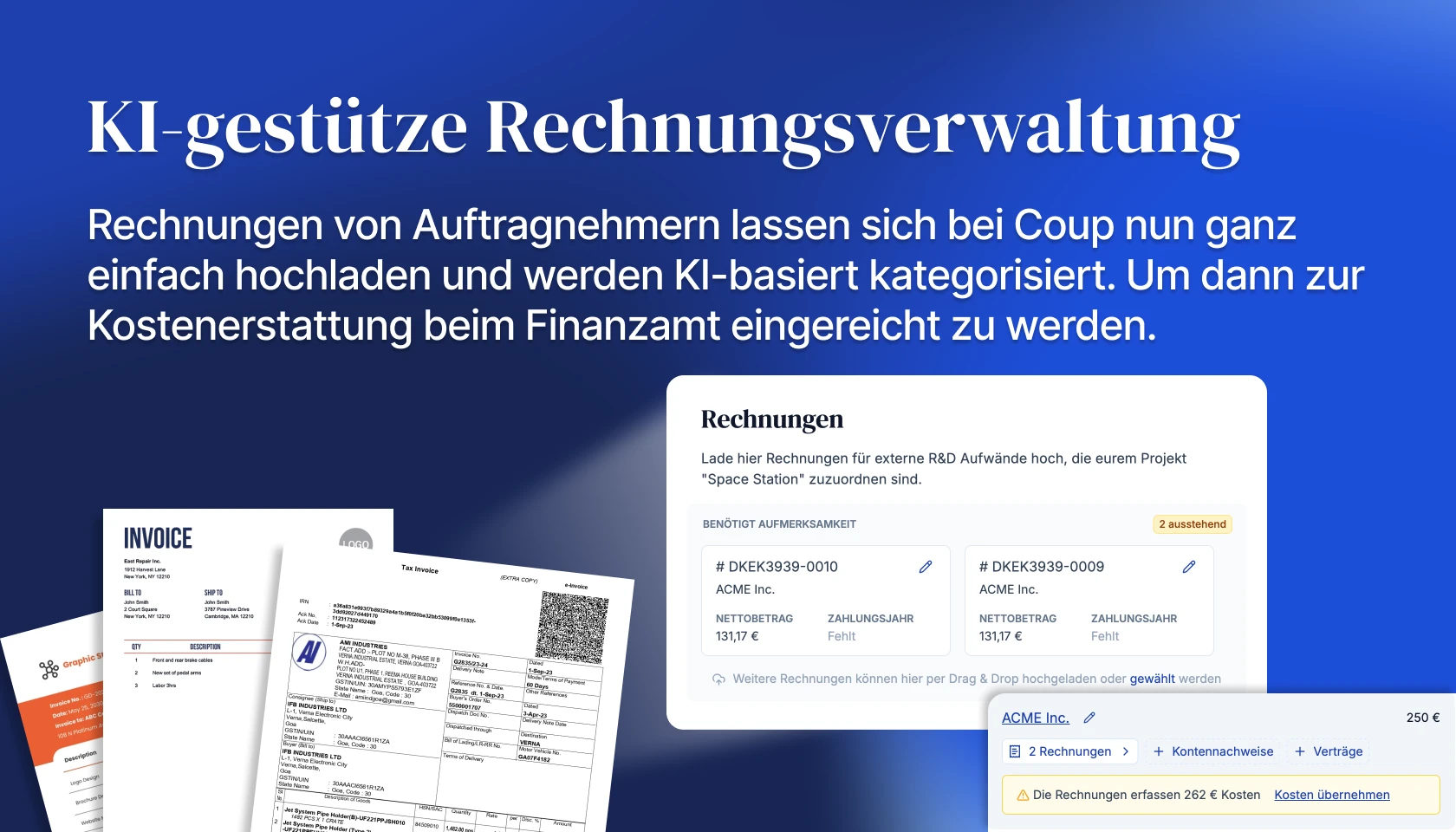 Damit die Dokumentation dieser Kosten keine Kopfschmerzen bereitet, bietet die Coup Plattform nun eine KI-gestütze Rechnungsverwaltung. Dort lädt man einfach Rechnungen hoch, deren Daten dann mittels KI ausgelesen und kategorisiert werden. Beim jährlichen Antrag auf Forschungszulage ergeben diese Daten dann die förderbaren Kosten für den Auftragnehmer - und sind durch die vorliegenden Rechnungen auch direkt lückenlos dokumentiert.