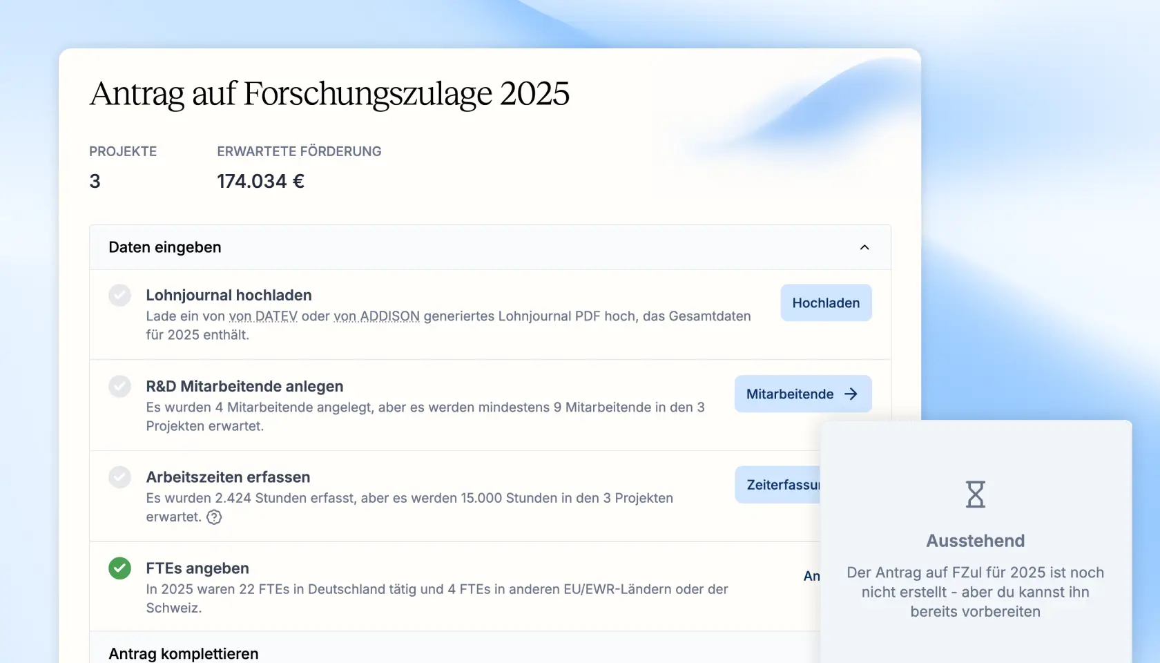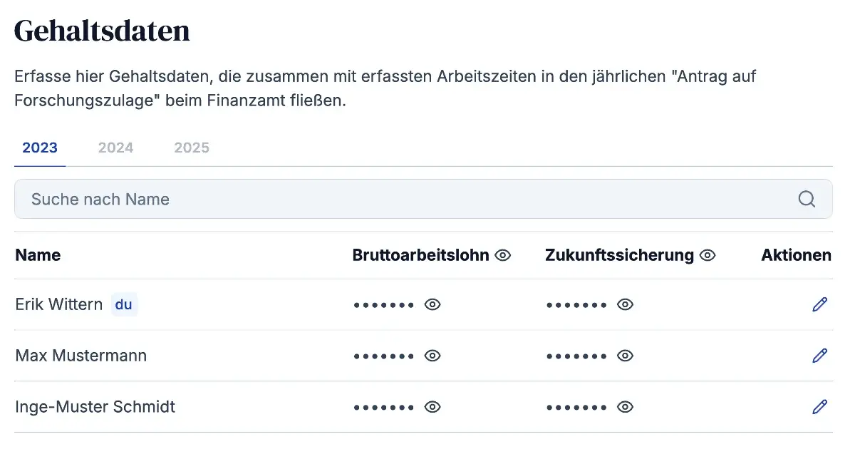 Der jährliche Antrag auf Forschungszulage weist unter Anderem die in R&D Projekten angefallenen Lohnkosten auf. Bisher mussten die Daten zur Berechnung dieser Kosten händisch gepflegt werden.