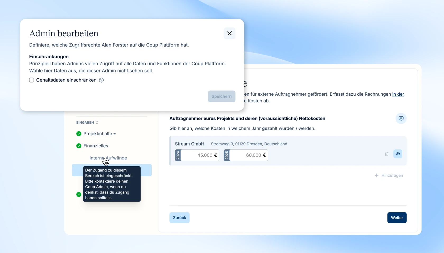 Coups Plattform unterstützt diesen Use-Case nun mit eingeschränkten Nutzerrollen. Bei der Anlage von weiteren Admin Nutzern kann gewählt werden, dass diese keinen Zugriff auf Gehaltsdaten erhalten sollen. In dem Fall sehen sie in der gesamten Plattform keine eingegebenen Gehaltsdaten und können nicht auf Lohnjournale oder F&E Reports zugreifen, die Gehaltsdaten beinhalten. Diese Einschränkungen können von voll berechtigten Admins jederzeit angepasst werden.