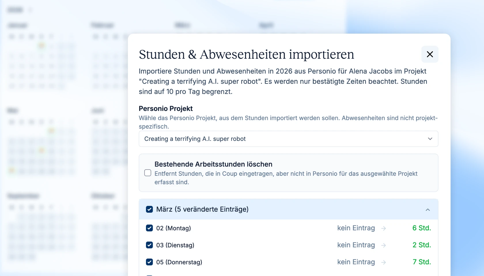 Arbeitszeiten sind in Personio mit Projekten verbunden. Coups UI erlaubt es, das entsprechende Projekt zu wählen. Eine einmal getroffene Wahl wird gespeichert, um zukünftige Importe zu erleichtern.