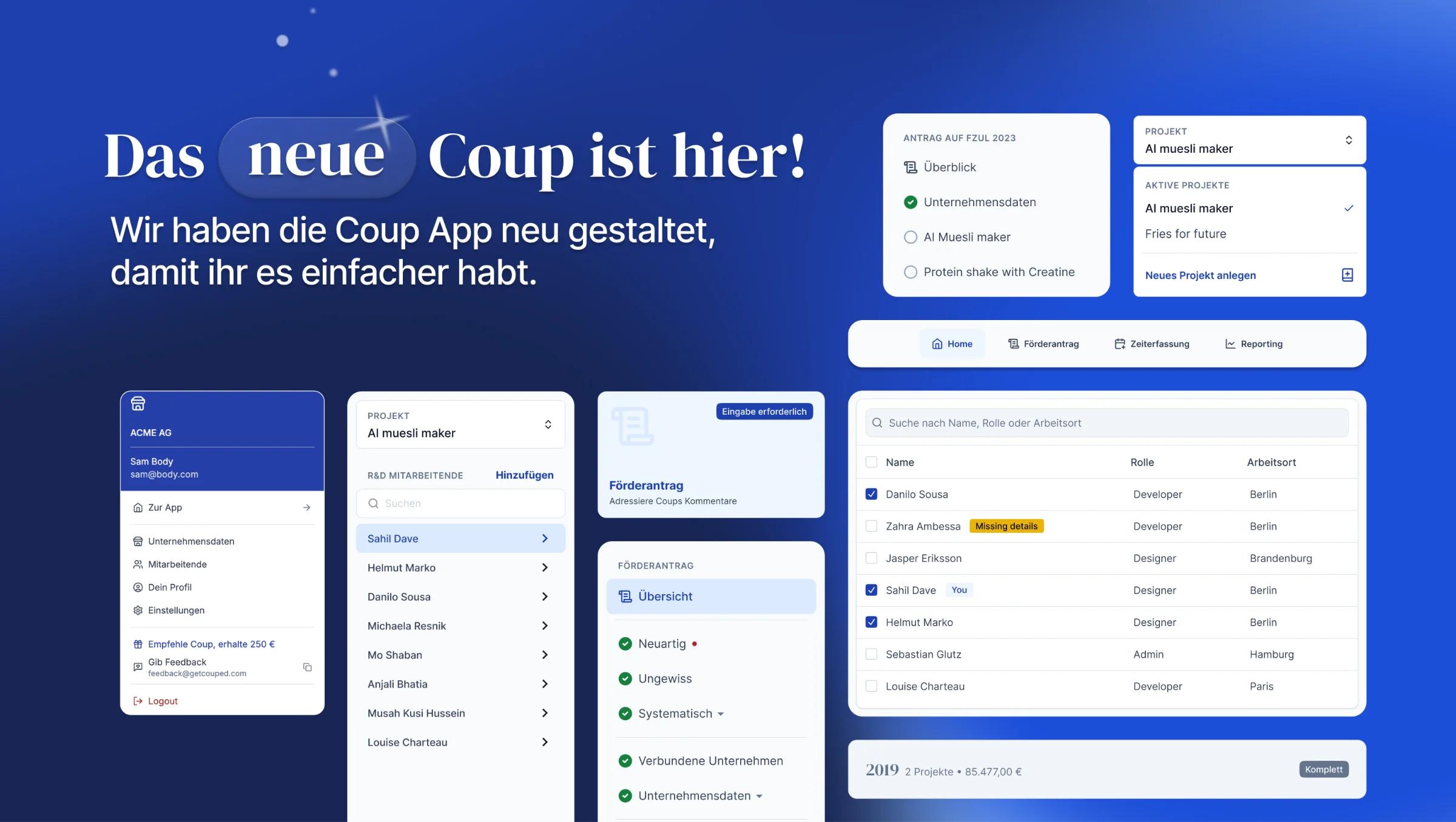 Inzwischen bietet Coups App deutlich mehr: Zeiterfassung für R&D Projekte, Erfassung von Personalkosten, die Unterstützung des jährlichen Antrags auf Forschungszulage beim Finanzamt, Integration mit HR-Systemen, oder unsere on-platform Kommunikation. Damit bilden wir den gesamten Forschungszulagen-Prozess ab.